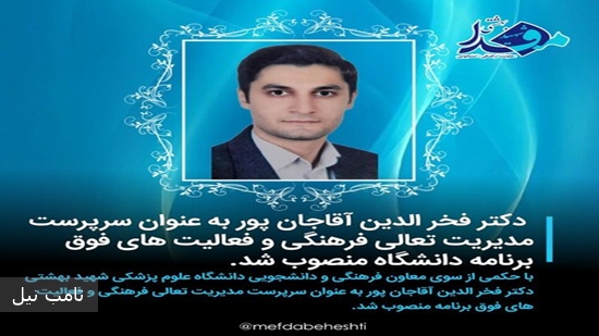 ️ به گزارش مفدا بهشتی، با حکمی از سوی معاون فرهنگی و دانشجویی دانشگاه علوم پزشکی شهید بهشتی، دکتر فخرالدین آقاجانپور، عضو هیئت علمی دانشکده پزشکی، به عنوان سرپرست مدیریت تعالی فرهنگی و فعالیتهای فوقبرنامه دانشگاه منصوب شد.