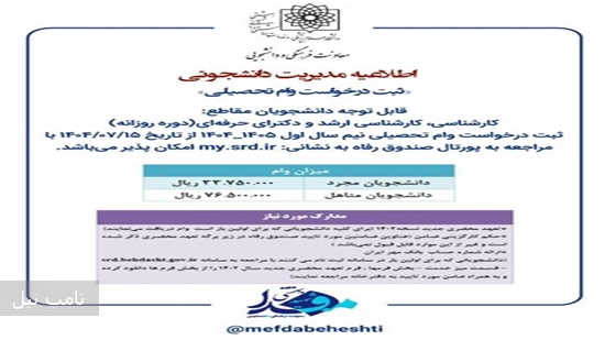 ثبتنام وام تحصیلی نیمسال اول ۱۴۰۵-۱۴۰۴ آغاز شد به اطلاع دانشجویان مقاطع کارشناسی، کارشناسی ارشد و دکتری حرفهای (دوره روزانه) میرسد که ثبت درخواست وام تحصیلی نیمسال اول از تاریخ ۱۵ مهر تا ۳۰ مهر ۱۴۰۴ از طریق پرتال صندوق رفاه دانشجویان به نشانی my.srd.ir امکانپذیر است. میزان وام: دانشجویان مجرد: ۳۲,۷۵۰,۰۰۰ ریال دانشجویان متأهل: ۷۶,۵۰۰,۰۰۰ ریال مدارک مورد نیاز: فرم تعهد محضری نسخه جدید ۱۴۰۲ (برای دریافتکنندگان جدید) شماره شبای بانک مهر ایران به نام دانشجومراجعه به سامانه srd.behdasht.gov.ir برای دریافت فرمها لازم است دانشجویان پس از ثبتنام اینترنتی، فرم تعهد محضری را در دفترخانه رسمی ثبت نمایند. به دانشجویان متاهل مرد در صورت ارائه اطلاعات خانوار به اداره رفاه دانشجویی، ماهیانه به ازای هر فرزند4.000.000 ریال تسهیلات اولاد تعلق میگیرد.