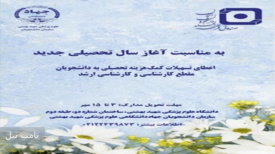به دانشجویان مقطع کارشناسی و کارشناسی ارشد به مناسبت آغاز سال تحصیلی جدید صندوق قرض‌الحسنه دانشجویان ایران برای مقاطع تحصیلی کارشناسی و کارشناسی ارشد کمک هزینه تحصیلی در نظر گرفته است. مهلت تحویل مدارک: ۳ تا ۱۵ مهرماه ظرفیت محدود مدارک: دانشجویان دانشگاه‌ علوم پزشکی شهید بهشتییک ضامن دانشجو، گواهی اشتغال به تحصیل ضامن و متقاضی، کپی کارت دانشجویی و کارت ملی ضامن و متقاضی، یک برگ چک صیادی اطلاعات بیشتر:۰۲۱-۲۲۴۳۹۸۷۳